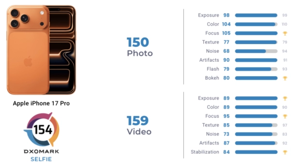 DxOMark поставила iPhone 17 Pro аж 154 балла — это на три пункта выше, чем у iPhone 16 Pro, и на целых семь впереди Google Pixel 9 Pro XL. Honor Magic6 Pro и iPhone 16 Pro теперь делят второе место с 151 баллом, а дальше следует iPhone 15 Pro с 149.