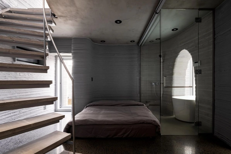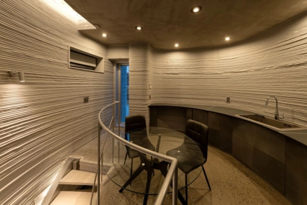 Специально адаптированный принтер COBOD послойно выдавливал бетонную смесь, создавая необычные плавные формы, напоминающие пещерные очертания — то, что в обычном строительстве стоило бы очень дорого или было бы почти невозможно реализовать. На весь объём ушло около 39 кубометров материала. Сам процесс печати прошёл быстро и с минимальным количеством рабочих на площадке.