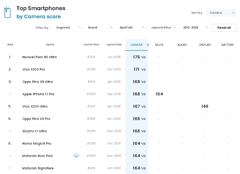 - Huawei Pura 80 Ultra — 175 баллов Лидер уже довольно долго. Самый высокий результат по фото, особенно в зуме, ночной съёмке и динамическом диапазоне. Почти идеальный универсальный камерофон 2026 года.