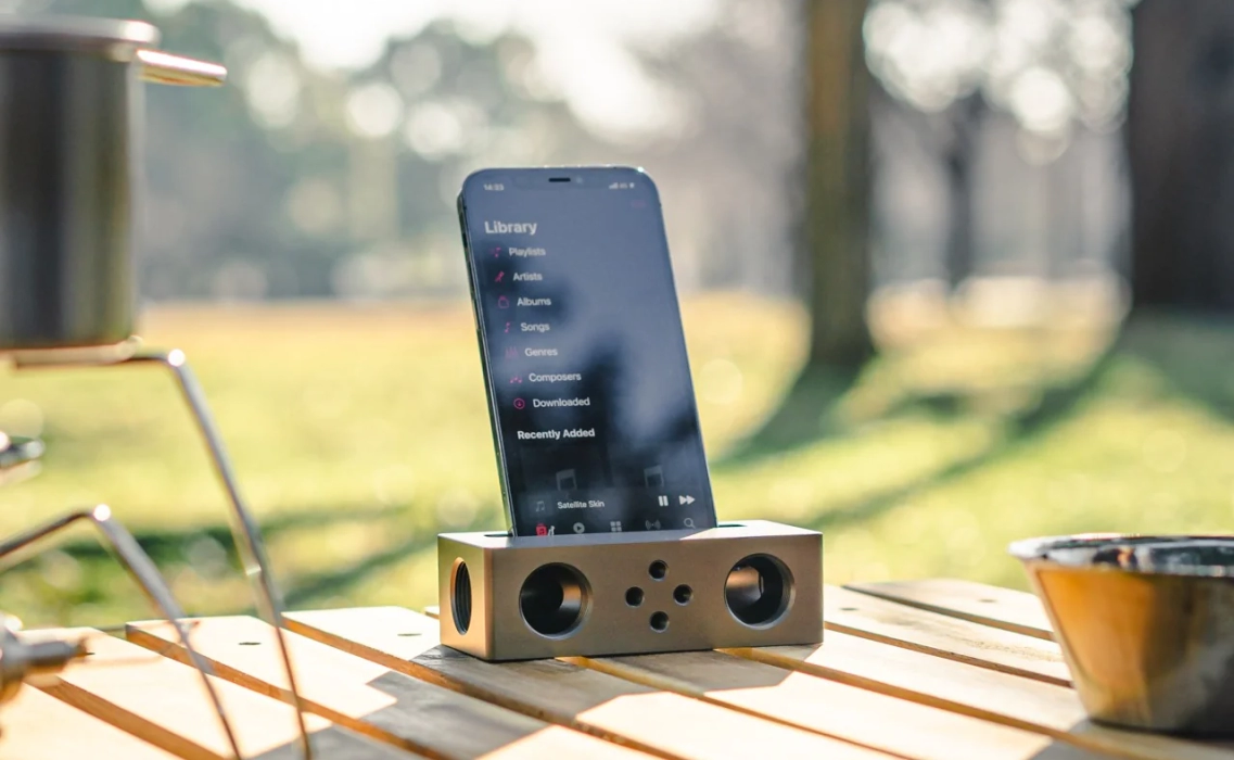 Представьте себе компактный металлический «резонатор», в который вы просто вставляете телефон. Телефон лежит горизонтально, его встроенный динамик оказывается внутри специальной полости, и звук начинает распространяться по законам волновой физики.