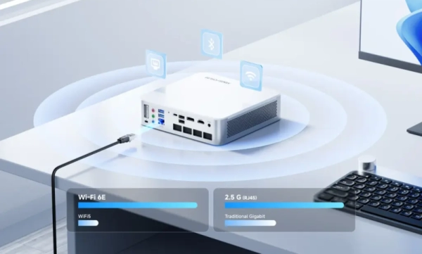 Размеры — всего 195 × 193 × 52 мм, а вес — около 1,12 кг — позволяют легко переносить мини-ПК из комнаты в комнату или даже брать с собой в поездки. Все порты и разъемы сосредоточены на задней панели, что подчеркивает чистоту линий спереди и избавляет от лишних проводов на виду. Это не просто эстетика: такой подход помогает поддерживать порядок и минимизировать беспорядок на столе.