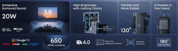 Проектор работает на Google TV, с предустановленным Netflix и поддержкой тысяч приложений. Внутри — 2 ГБ оперативки и 32 ГБ хранилища, так что лаги минимальны, а подключение внешних устройств (ноутбук, консоль) через HDMI, USB-C или USB-A — проще простого. Единственный нюанс: встроенного аккумулятора нет, так что для полной автономии нужен внешний power bank. Динамики, кстати, держат заряд до 20 часов — хватит на целый уик-энд.